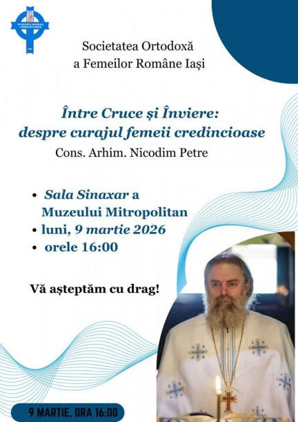 Societatea Ortodoxă a Femeilor Române Iași organizează, de la ora 16.00, conferința intitulată: „Între Cruce și Înviere: despre curajul femeii credincioase”, susținută de părintele arhimandrit Nicodim Petre, Consilierul Sectorului de Misiune, Statistică și Prognoză Pastorală al Arhiepiscopiei Iașilor și Starețul Mănăstirii Bucium din Iași. Evenimentul va avea loc în Sala Sinaxar a Muzeului Mitropolitan și se adresează membrelor SOFR, precum și publicului larg interesat de tematica propusă. Conferința își propune să ofere un prilej de reflecție asupra rolului și curajului femeii credincioase în contextul vieții contemporane.